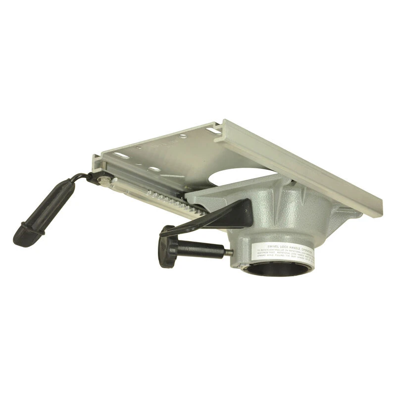 2-7/8″ post mount with bushing for snug fit. Made of high-strength aluminum. Large 7-1/4″ x 13″ seat mounting platform, travels 5-1/4″ forward and backward on self lubricating pads. Adds 1-1/4″ to height of pedestal.