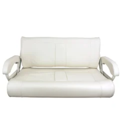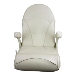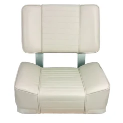 Injection molded seats with interlocking hinge for greater structural support. Extra wide seat, premium high quality upholstery for all day comfort, with synthetic boat fabric weather resistant, mildew resistant, optimal UV protection.