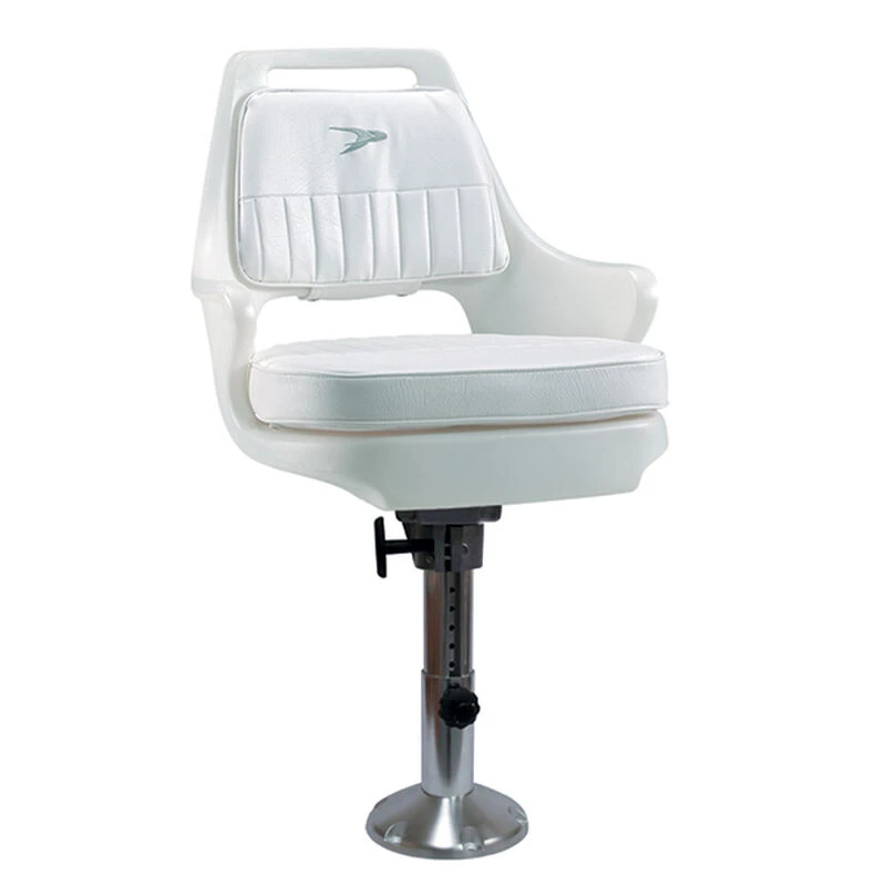 Wise 8WD015 Pilot Z Helm Chair & Pedestal Combo Features 8WP21-18S ABYC class AD driver 12″ to 18″ adjustable pedestal with seat slide. Chair is constructed with thick wall rotational molded plastic frame with pre-mounted plastic injection molded mounting plate with T-nut inserts. Snap on and off cushions have high compression foam padding with mesh underlay to expel moisture. UV and mildew treated marine grade vinyl with embossed vinyl surface and embroidered logo. Molded arm rests. Pedestal features polished cast aluminum 9″ base plate with recessed knurled mounting holes. 2 7/8″ diameter thick wall extruded aluminum post. Cast aluminum seat mount swivels 360 degrees and locks down tight.